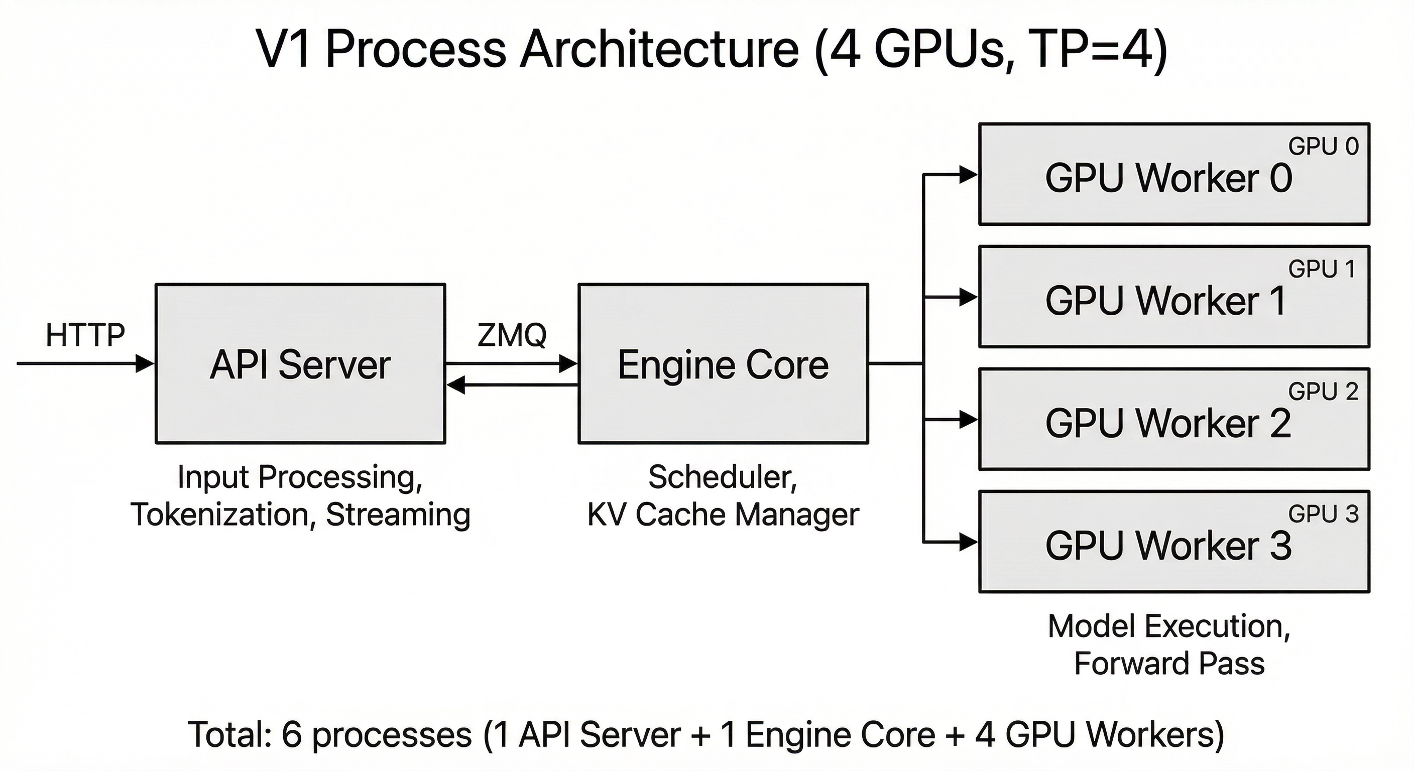 - 1 API server + 1 engine core + 4 GPU workers = 6 processes